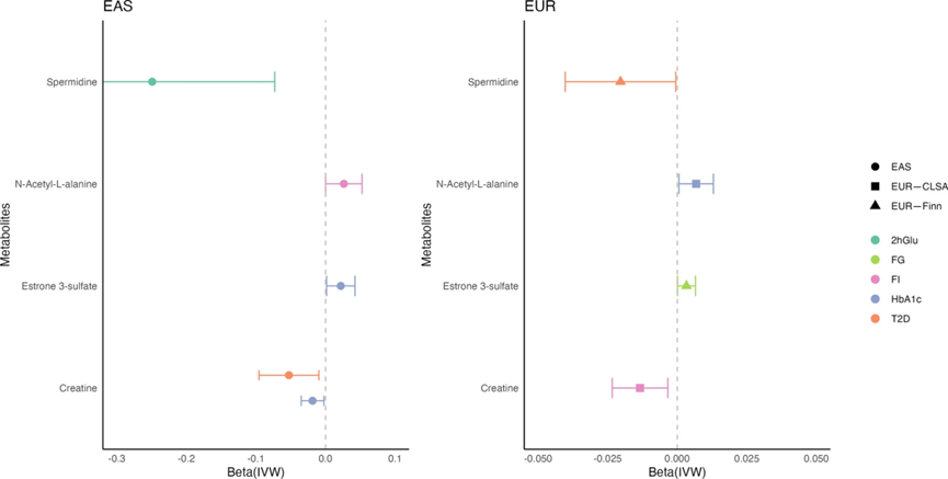 值得注意的是,發(fā)現(xiàn)4對關(guān)聯(lián)的代謝物-性狀顯示出跨祖先一致性(圖5)。亞精胺和肌酸是T2D的潛在保護(hù)因素。具體而言,亞精胺與EAS祖先的2hGlu水平和EUR祖先的T2D風(fēng)險呈負(fù)相關(guān)。較高水平的肌酸與EAS祖先較低的HbA1c水平和T2D風(fēng)險相關(guān),與EUR祖先較低的FI水平相關(guān)。同時,N-乙酰-L-丙氨酸和硫酸雌酮是血糖性狀的潛在危險因素。N-乙酰-L-丙氨酸與EAS祖先的FI水平和EUR祖先的HbA1c水平呈正相關(guān)。較高水平的雌酮3-硫酸鹽與較高水平的HbA1c在歐元血統(tǒng)和FG在EAS血統(tǒng)相關(guān)聯(lián)。