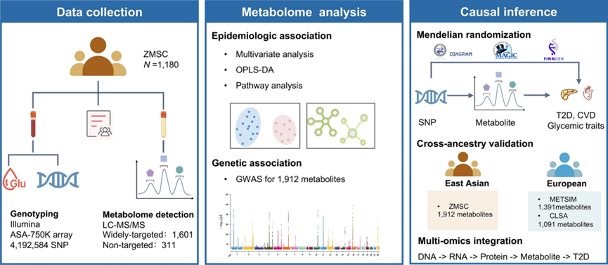代謝物在2型糖尿?。?/span>T2D)及其心血管并發(fā)癥的生物過程中起關(guān)鍵作用。然而,它們對這些疾病的貢獻(xiàn)尚未得到全面評估,尤其是在東亞血統(tǒng)中。本研究使用高覆蓋度的廣泛靶向和非靶向代謝技術(shù)分析了總共1912種代謝物,采用多變量logistic回歸模型和正交偏最小二乘判別分析鑒定T2D相關(guān)代謝物。在浙江代謝綜合征隊列(ZMSC)中進(jìn)行了全代謝組全基因組關(guān)聯(lián)研究(GWAS),然后進(jìn)行了雙樣本孟德爾隨機(jī)化(MR)分析,以探索潛在的因果代謝物-T2D關(guān)聯(lián)。為增強(qiáng)跨血統(tǒng)的泛化性,在歐洲血統(tǒng)中進(jìn)行了MR分析,以探討血清代謝物對T2D及其心血管并發(fā)癥的潛在因果影響。還整合多組學(xué)證據(jù)以探索潛在的分子機(jī)制。結(jié)果確定了6種與中國T2D相關(guān)的代謝物,并得到了代謝組分析和遺傳知情因果推斷的支持。其中包括兩個潛在的保護(hù)因素(PC[O-16:0/0:0]及其衍生物LPC[O-16:0])和四個潛在危險因素([R]-2-羥基丁酸、2-甲基乳酸、依普利酮和蘿芙素)。跨祖先代謝組范圍分析進(jìn)一步揭示了四種共享的潛在致病代謝物,突出了肌酸對T2D的潛在保護(hù)作用。通過多組學(xué)整合揭示了由CPS1附近的遺傳變異(編碼尿素循環(huán)相關(guān)線粒體酶)初始化的潛在調(diào)節(jié)途徑,該變異影響血清肌酸水平并調(diào)節(jié)T2D。MR分析進(jìn)一步表明,9種尿素循環(huán)相關(guān)代謝物顯著影響T2D的心血管并發(fā)癥。本研究為T2D的代謝基礎(chǔ)及其心血管并發(fā)癥提供了新的見解,強(qiáng)調(diào)了尿素循環(huán)相關(guān)代謝物在疾病風(fēng)險和進(jìn)展中的作用。這些發(fā)現(xiàn)促進(jìn)了對T2D病因中循環(huán)代謝物的理解,為未來的研究提供了潛在的生物標(biāo)志物和治療靶點(diǎn)。