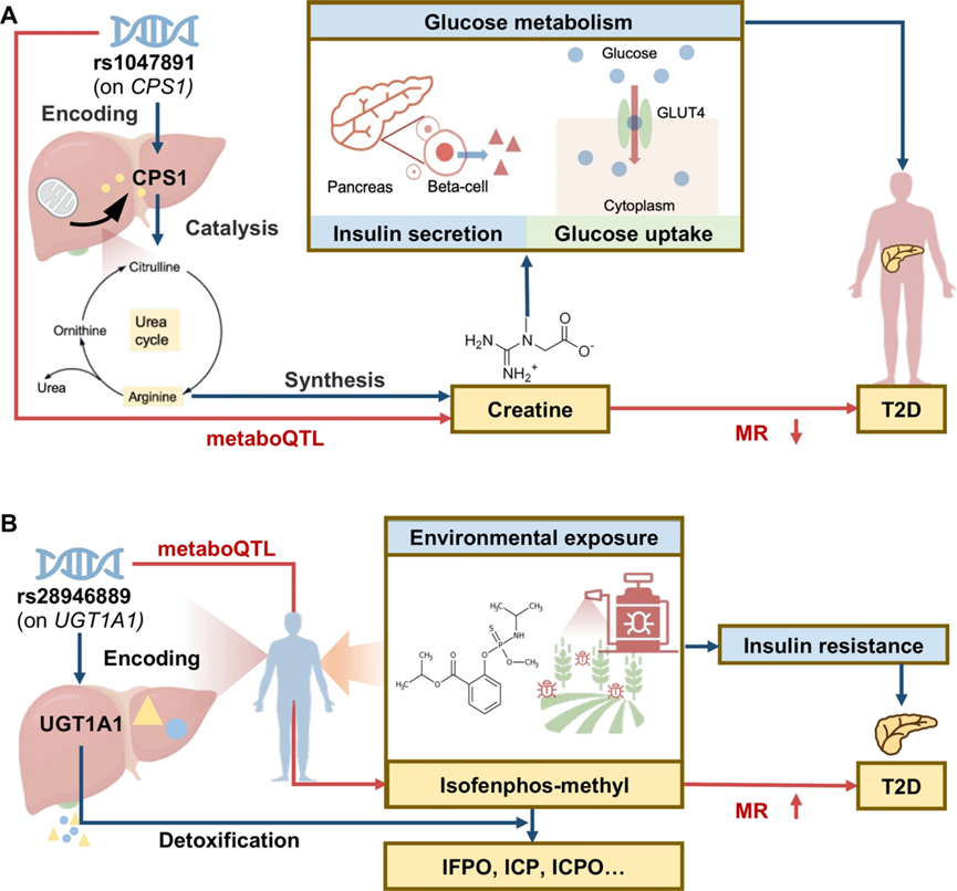 還整合多維證據(jù)來探索環(huán)境暴露IFP影響T2D的潛在分子途徑(圖6B)。IFP可以在肝微粒體中降解為IFPO、ICP和ICPO。在基因組水平上,發(fā)現(xiàn)UGT1A1基因上的SNP rs28946889是ZMSC中血清異甲硫磷的元QTL(效應(yīng)等位基因:T,beta=?0.24,P=2.13×10-8)。在轉(zhuǎn)錄組學(xué)和蛋白質(zhì)組學(xué)水平,UGT1A1基因在肝臟中高度表達(dá),并編碼一種藥物代謝酶,該酶在代謝和解毒中起著關(guān)鍵作用(GTEx v10,效應(yīng)等位基因:T,正常效應(yīng)大小=0.23,P=8.30×10?6)。在表型組學(xué)水平,發(fā)現(xiàn)遺傳預(yù)測的IFP是中國人T2D的危險因素。在機(jī)制上,IFP-T2D關(guān)聯(lián)涉及IFP誘導(dǎo)的胰島素抵抗。總的來說,這些發(fā)現(xiàn)支持了IFP分子調(diào)控的一個假設(shè)的遺傳-表達(dá)-蛋白-代謝-表型證據(jù)鏈。