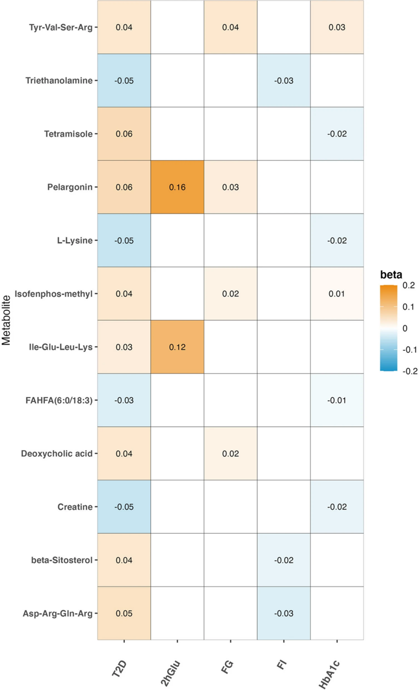 進(jìn)行全面的MR調(diào)查以探索代謝物在T2D和EAS祖先血糖特征中的潛在因果作用。圖4顯示了12種與T2D顯著相關(guān)的代謝物,以及東亞祖先中四種血糖特征(2hGlu、FG、FI和HbA1c)中的至少一種。在12種可驗證的代謝物與T2D的關(guān)聯(lián)中,9對在血糖特征中得到了進(jìn)一步驗證。值得注意的是,遺傳易感性與較低的HbA1c水平和T2D風(fēng)險相關(guān)。天麻素是T2D的潛在危險因素,與FG和2hGlu呈正相關(guān)。有機(jī)磷農(nóng)藥甲基異氟磷(IFP)也是T2D的危險因素,與FG和HbA1c呈正相關(guān)。L-賴氨酸和FAHFA(6:0/18:3)是必需氨基酸和脂肪酸,是T2D的保護(hù)因素,對HbA1c具有保護(hù)作用。脫氧膽酸是腸道微生物群產(chǎn)生的代謝產(chǎn)物,與T2D風(fēng)險增加和HbA1c水平升高呈正相關(guān)。此外,觀察到三種氨基酸衍生物(Tyr-Val-Ser-Arg、Ile-Glu-Leu-Lys和Asp-Arg-Gln-Arg)水平升高與T2D風(fēng)險增加有關(guān),Tyr-Val-Ser-Arg和Ile-Glu-Leu-Lys進(jìn)一步證實(shí)了它們與血糖特征的相關(guān)性。