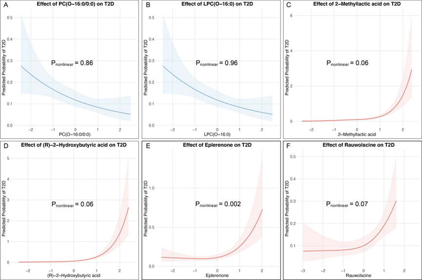 為進(jìn)一步探索血清代謝物與T2D之間的潛在非線性關(guān)系,在ZMSC中采用了RCS分析。分析側(cè)重于六個代謝物與T2D的關(guān)聯(lián),這些關(guān)聯(lián)得到了觀察和遺傳學(xué)證據(jù)的一致支持。調(diào)整了幾個可能影響代謝物的混雜因素,包括年齡、性別、BMI、吸煙和飲酒。使用最小AIC來選擇最佳的RCS節(jié)點(diǎn)數(shù)量,每個代謝物的最終模型包含三到四個節(jié)點(diǎn)。結(jié)果表明PC(O-16:0/0:0)、LPC(O-16:0)、2-甲基乳酸、2-羥基丁酸和蘿芙素與T2D的相關(guān)性主要呈線性趨勢,沒有顯著的非線性效應(yīng)或拐點(diǎn)證據(jù)(圖3)。相比之下,依普利酮和T2D之間的相關(guān)性顯示出“J”形(P非線性=0.02)。