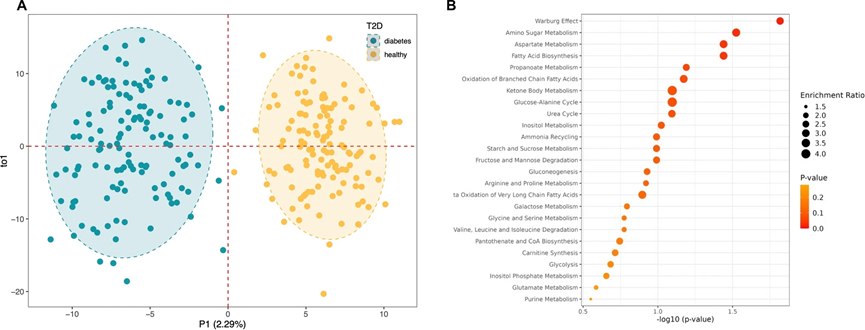 進(jìn)行功能富集分析和通路分析,以確定可能與T2D相關(guān)的潛在代謝途徑。只有符合多變量邏輯斯諦回歸中FDR校正P<0.05的統(tǒng)計顯著性閾值且VIP評分>1的代謝物才被納入通路分析(164種代謝物)。發(fā)現(xiàn)T2D相關(guān)代謝物在涉及“瓦博格效應(yīng)”、“氨基酸糖代謝”、“天冬氨酸代謝”和“脂肪酸生物合成”的途徑中顯著富集,P值分別為0.0152、0.0299、0.0363和0.0363(圖1B)。