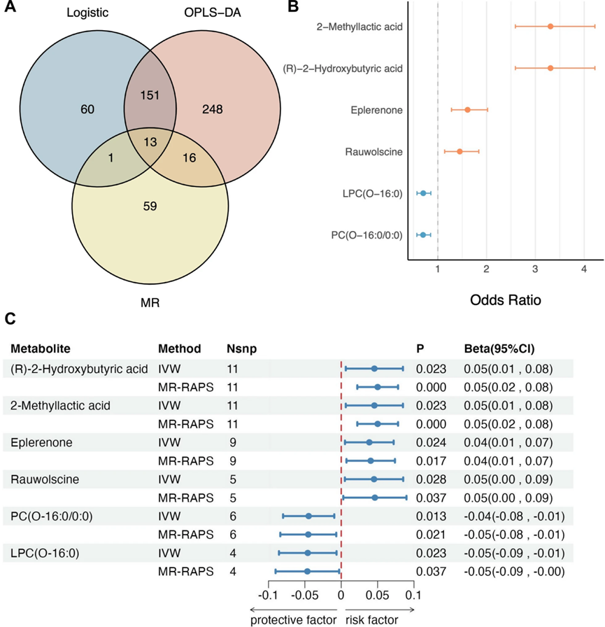 為估計潛在的反向因果關(guān)系,對代謝物與T2D關(guān)聯(lián)進(jìn)行了反向MR分析。結(jié)果顯示,75種代謝物可能受到T2D的影響,89種代謝物與T2D關(guān)聯(lián)中只有3種受到干擾。這些發(fā)現(xiàn)表明反向因果關(guān)系的證據(jù)很少。在敏感性分析中,不包括來自ZMSC的130名T2D參與者,全代謝組GWAS和MR分析確定98種T2D相關(guān)代謝物,93.26%(83種代謝物)的原始發(fā)現(xiàn)被復(fù)制。這些結(jié)果進(jìn)一步支持了發(fā)現(xiàn)的穩(wěn)健性和可靠性。Venn圖(圖2A)總結(jié)了多項式logistic回歸、OPLS-DA和雙樣本MR分析的結(jié)果,使用結(jié)合觀察分析(PFDR<0.05,VIP>1)和代謝組范圍MR分析(PIVW<0.05,PMR-RAPS<0.05,PPleitroy>0.05和PHeterogeneity>0.05)的標(biāo)準(zhǔn),確定了13種潛在的因果代謝物-T2D關(guān)聯(lián)。其中,6種代謝物在觀察性研究和遺傳學(xué)分析中表現(xiàn)出一致的效果(圖2B,C)。值得注意的是PC(O-16:0/0:0)及其衍生物LPC(O-16:0)是T2D的潛在保護(hù)因素,(R)-2-羥基丁酸、2-甲基乳酸、依普利酮和蘿芙素是T2D的潛在危險因素。
